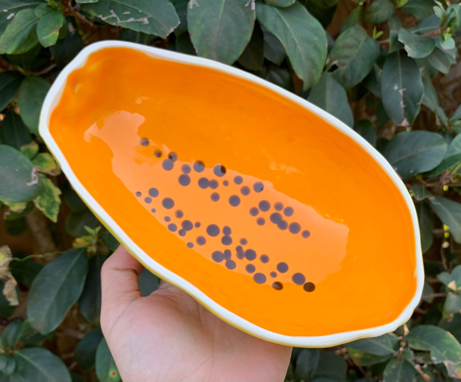 Eat your favorite tropical fruit out of this papaya bowl. Molded from a real florida papaya (grown in my neighbor’s yard!) this earthenware bowl has the shape and color of the papaya with a smooth orange glazed inside and a soft yellow outside. Complete with its signature black, round seeds individually painted on the inside.